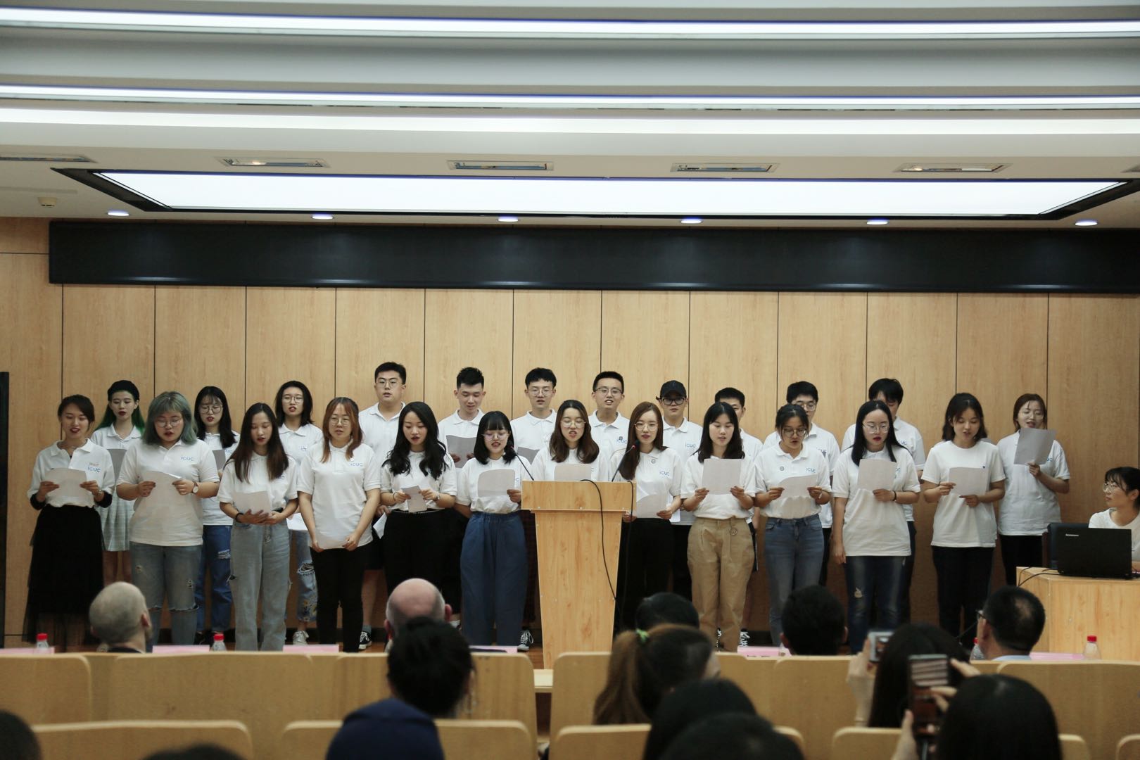 最后,2019级硕士新生表演新生小合唱《挥着翅膀的女孩》,借以表达同学们对中外方老师的敬意和感谢,新生小合唱表演将典礼现场推向高潮。