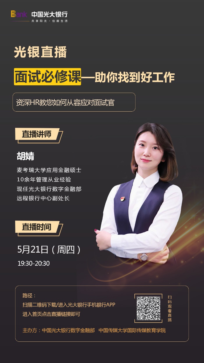 (通讯员 靳薇 王昕)5月21日,太阳集团城官网1407特邀请光大银行资深HR胡婧副处长为2020届毕业生来带了一场干货满满的线上讲座——面试必修课,助力学生疫情期间的就业面试,提升学生就业主动性、积极性,建立学生的就业信心。