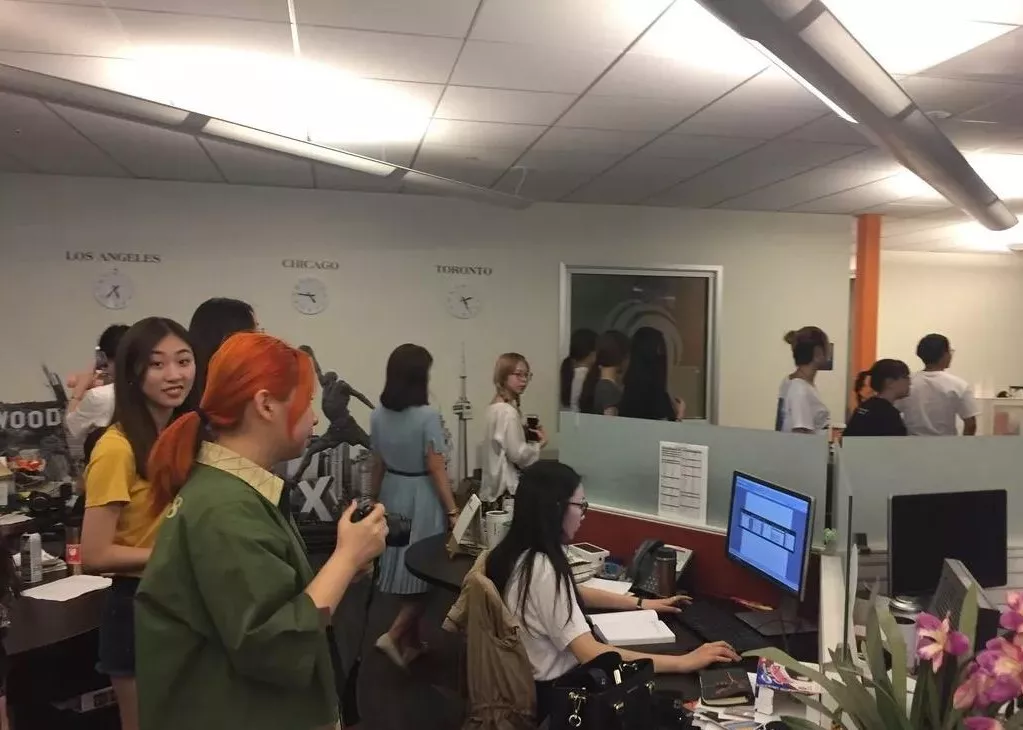 项目负责人Maggie接待了远道而来的同学们,并带领了同学们参观了凤凰卫视美洲台的大楼,电视台的工作环境整洁干净,各个工作室尽管空间有限但是五脏俱全,设备使用效率极高,为同学们展现了严谨高效的媒体工作氛围。