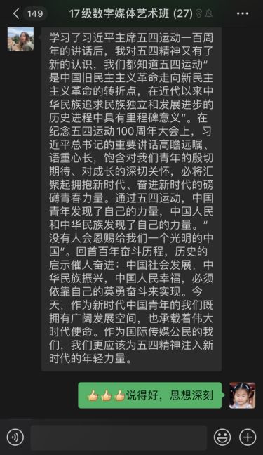 17级数字媒体艺术班的同学们在团支书的带领下,对去年习近平主席纪念五四运动100周年的重要讲话报道进行了学习,并在在班级微信群内发感想。其中,彭凯瑞同学感慨道:“今天,作为新时代中国青年的我们既拥有广阔发展空间,也承载着伟大时代使命。作为国际传媒公民的我们,我们更应该为五四精神注入新时代的年轻力量。”同学们热烈的讨论,展现了他们心中的责任和担当。