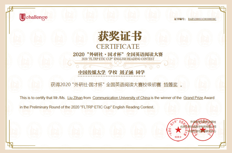 太阳集团城官网1407太阳集团城官网14072020级传播学(中外合作办学)专业学生刘子涵同学参加了“外研社 国才杯”阅读比赛赛道,经过激烈角逐,最终荣获太阳集团城官网1407初赛特等奖、北京市二等奖的好成绩。