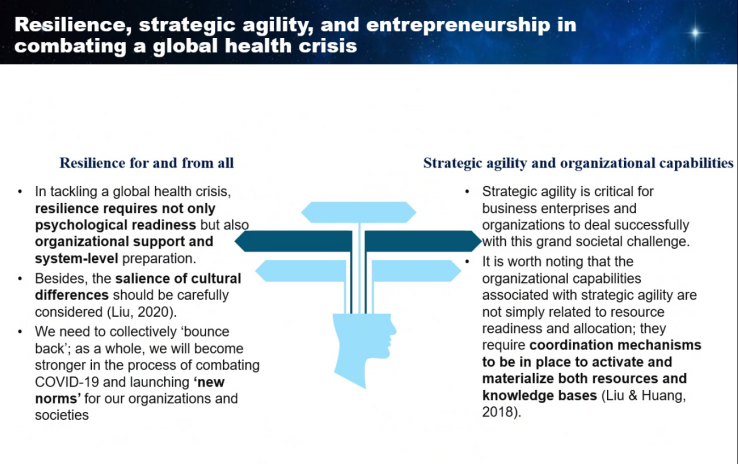 刘教授向同学们分享了他近期的研究成果。他运用比较视角,研究了中国、新加坡、韩国三国企业在疫情下面临的经济挑战。刘教授为同学们阐释了弹性(resilience)及敏捷性(agility)两个概念。弹性指抗压能力,个人、组织和社会层面都需要弹性,从而在疫情时代和后疫情时代做出好的调整和应对。敏捷性则是指调动各种资源的能力,我们需要运用创造性思维,跳出原有的框架,把现有的能力和资源转变为新的机会。