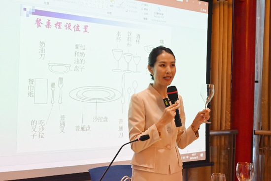 在讲座的第三部分,徐老师通过亲自示范,为大家介绍了西餐礼仪及西餐餐具、酒杯的使用方法,包括敬酒礼、就坐礼仪、餐巾礼仪等。徐老师指出每个国家的就餐礼仪与该国家的文化传统息息相关,只有了解当地的历史文化,方能培养更好的礼仪。