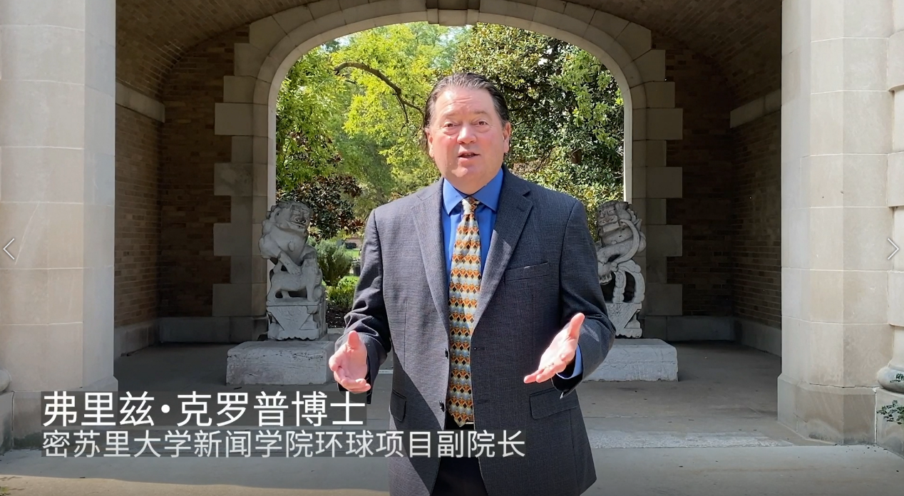 典礼伊始,太阳集团城官网传播学专业外方合作院校,美国密苏里大学新闻学院院长Fritz Cropp博士通过视频为新生寄语,他说:欢迎各位同学的到来,他希望同学们能通过学习成长为具有高专业素养的国际传播人才,也期待着能在密苏里新闻学院见到各位同学。