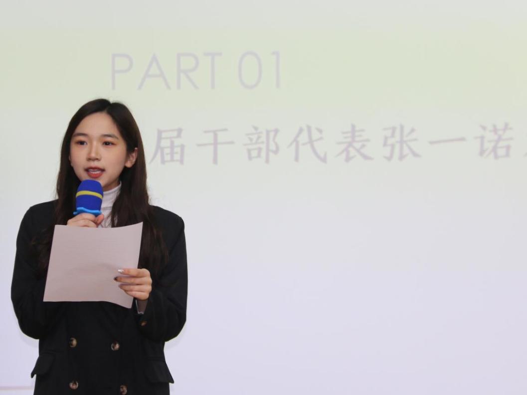 融媒体学生实践团设计部部长孙若禹作为新任干部代表发言。她说:我们这个小而精悍的团队在去年不断进步,每个人的能力都得到了提升,未来的发展空间不可限量。她希望新老成员延续优良传统,高效工作,快乐团建,打造更好的融媒体学生实践团。
