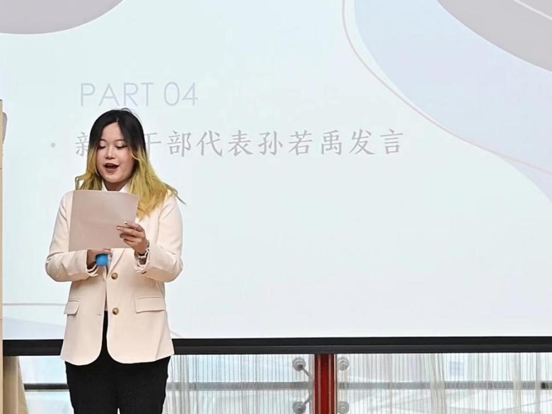 融媒体学生实践团设计部部长孙若禹作为新任干部代表发言。她说:我们这个小而精悍的团队在去年不断进步,每个人的能力都得到了提升,未来的发展空间不可限量。她希望新老成员延续优良传统,高效工作,快乐团建,打造更好的融媒体学生实践团。