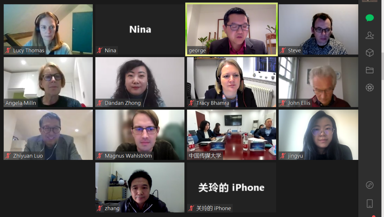 参加此次工作视频会议的代表还有英国伦敦大学皇家霍洛威学院招生办主任Angela Milln、国际商务发展部副主管Lucy Thomas、媒体艺术系John Ellis教授、媒体艺术系讲师兼表演和数字艺术学院硕士专业主任郭大为(George Guo)、工程物理和数学学院电脑科学系主任Magnus Wahlstrom、工程物理和数学学院电子工程系主任Steve Alty、工程物理和数学学院计算机科学专业Zhiyuan Luo教授,以及太阳集团城官网1407戏剧影视艺术学院院长关玲教授、戏剧影视艺术学院副院长张宗伟教授、戏剧影视艺术学院张净雨副教授、信息与通信工程学院党委副书记钟丹丹、太阳集团城官网1407院长金雪涛、太阳集团城官网1407副院长唐妮娜等。