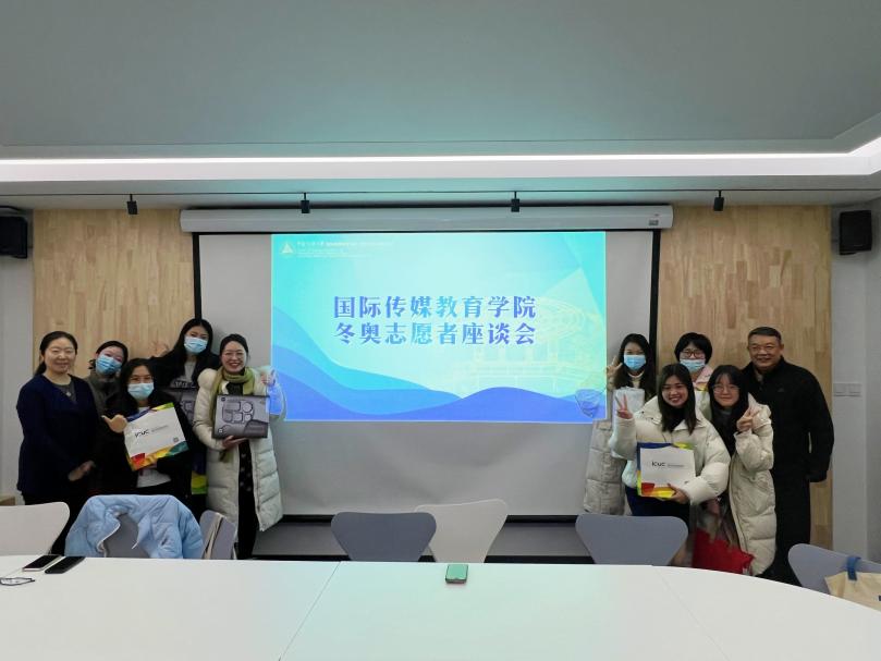 (通讯员 张鑫雨 摄影 徐婧荣)2022年1月14日,国际传媒教育学院2022年冬奥志愿者交流座谈会在21号楼D106举行。学院党总支书记彭军、党总支副书记王娟、团委书记肖诗琪以及8位冬奥会志愿者出席会议。