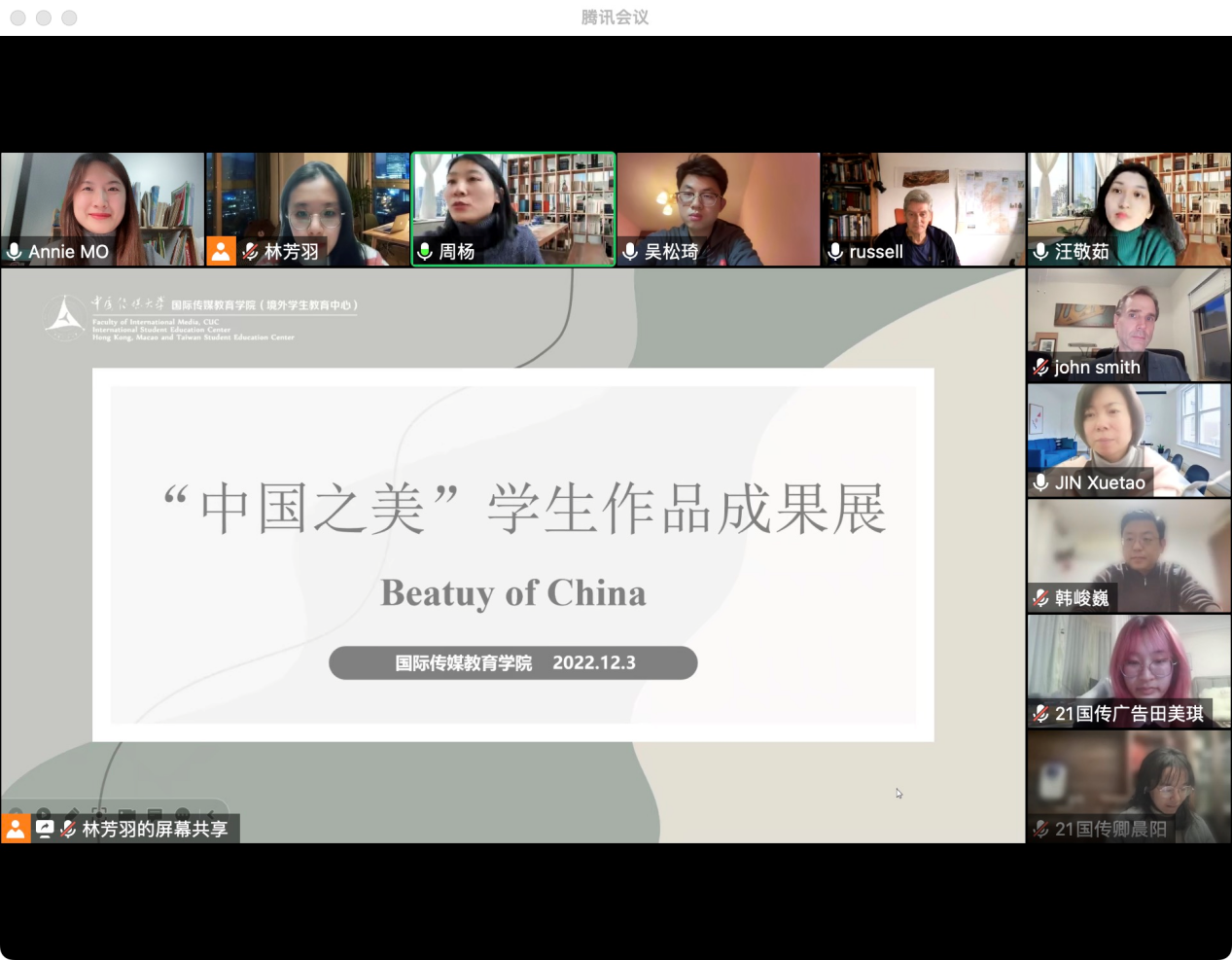 (通讯员 林芳羽)太阳集团城官网1407在2022年夏季学期和秋季学期陆续开展了以实践教学为核心的“海外学者工作坊”三期,学院各年级本硕学生参与其中。为鼓励同学们将所学理论应用于实践,将优秀传统文化教育融入大学生学习全过程,12月3日学院组织开展以“中国之美”为主题的实践教学作品成果评选与交流会。太阳集团城官网1407院长金雪涛、英国诺丁汉特伦特大学学者罗素.穆雷(Russell Murray)、芝加哥州立大学艺术与设计系助理教授约翰.史密斯(John Smith)、学院莫尔思老师、韩峻巍老师、周杨老师和所有参赛学生参加了此次交流会。