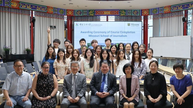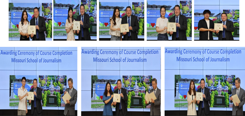 密苏里新闻学院副院长Fritz Cropp、中国项目负责人章于炎为学生颁发学习证明