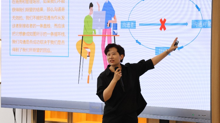 开课仪式上,外语教学与研究出版社外研教育测评中心总经理王悦展开了“以终为始,决胜未来”的主题分享。王悦总经理以职场经历为案例,生动地提出了“以终为始”的理念,即学习和工作都要首先认清方向,以目标为导向,并付诸实际行动。她强调了学涯终点意味着职涯起点,职场素养不仅体现在知识、专业技能等硬实力上,更需加强综合能力、个性特征、动机、价值观等软实力的提升。大学一年级新生只有提前储备职场胜任力才能 “决胜未来”。此外,她还从管理沟通、沟通策略、书面沟通、口头沟通四个方面对如何提高沟通能力进行了重点讲解,并勉励大家踏实勤勉、勇敢创新,脚踏实地朝着梦想前行,终有一天能实现自己的理想。