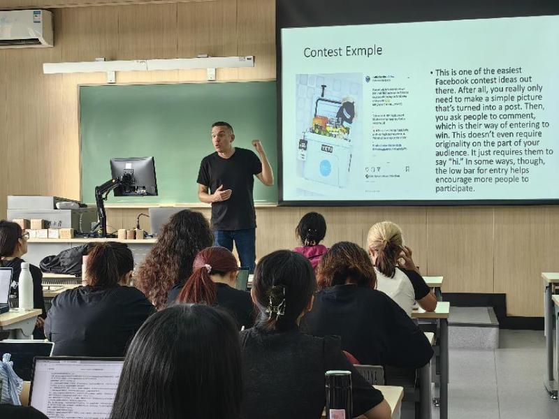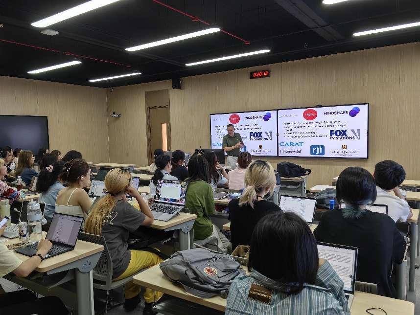 课程开始后,Brad 首先高屋建瓴,从融媒体创意产品市场推广的理论和路径两方面进行整体阐述,随后结合密苏里新闻学院学生团队的成功案例和“顶石课程”在中传团队中的优秀成果进行具体分析,引导学生深入理解如何把握客户需求、调研商业模式、分析产品受众、创意转化为多样的融媒体产品。