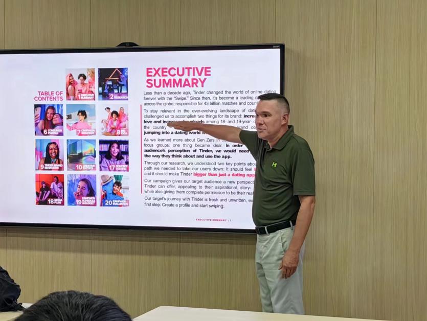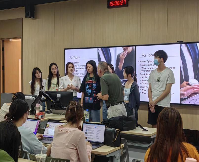 在本次课程的后半阶段,Brad邀请每个团队分组介绍规划方案,从团队分工、客户目标、创意设计、现实竞争等多方面进行专门提问和分类指导,协助每组同学进行具体的SWOT分析,并布置了项目推进的中期目标和最终提交要求。其精辟的分析、敏锐的洞见极大地激发了学生的参与热情。