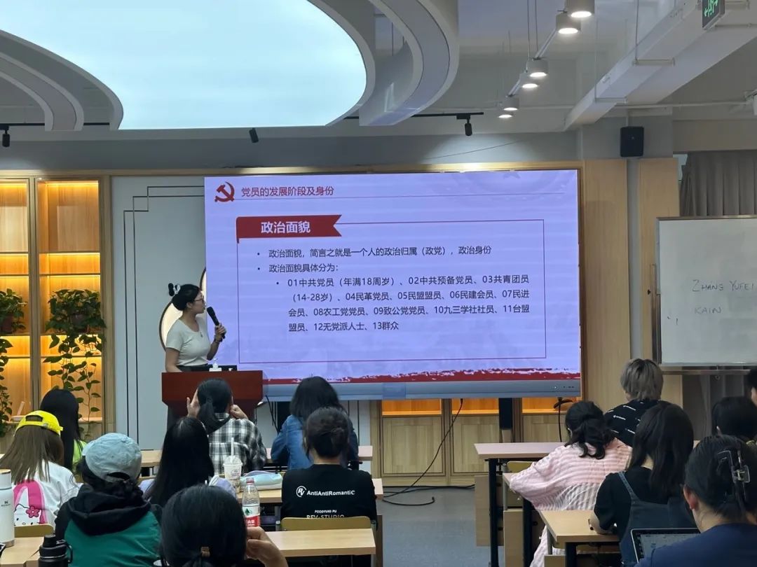 学院团委副书记肖诗琪老师首先介绍了学院基本团务工作情况,具体包括新生团组织关系转入工作、“推优”入党工作流程与要求等。学生第二党支部书记吴思瑜则从党支部的角度具体介绍发展党员的流程,带领同学们深入了解学校、学院党组织的基本架构等,通过表格与流程图的形式,为同学们清晰呈现入党五个阶段的具体内容。