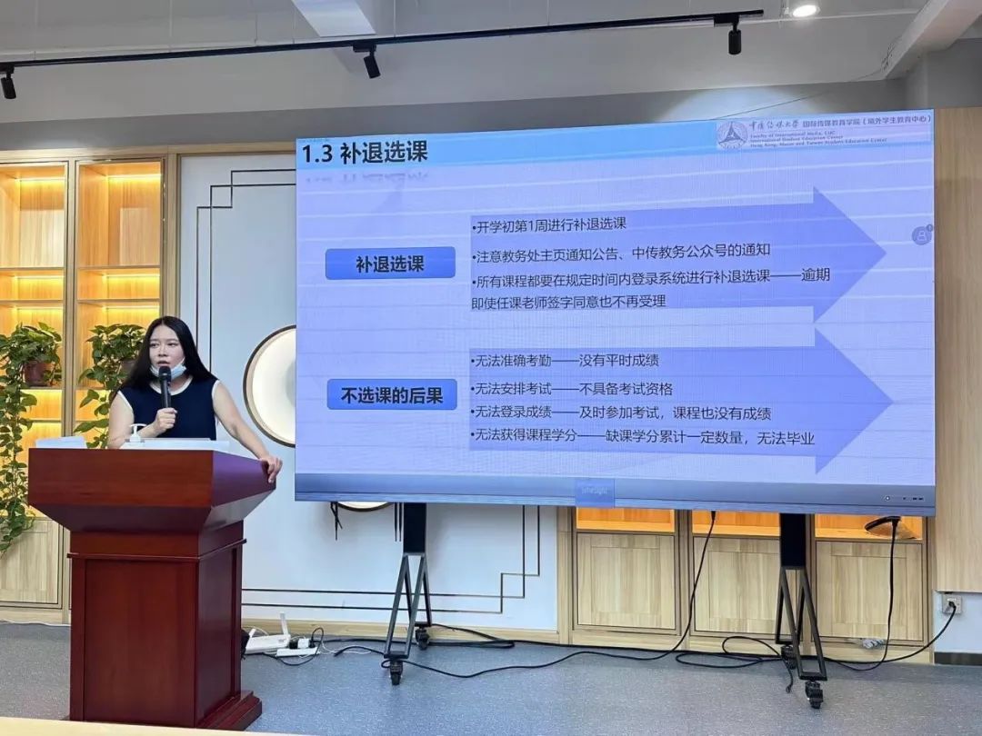 学院教务员老师就中外联合培养方案中的重点环节,以及教学运行中的学籍管理规定、考试管理规定、重修补考和成绩记载等问题进行了详细讲解,特别是对学习纪律进行了重点提醒。学院还制作了2023级学生手册,以帮助同学们熟悉学习环境、进入学习状态。