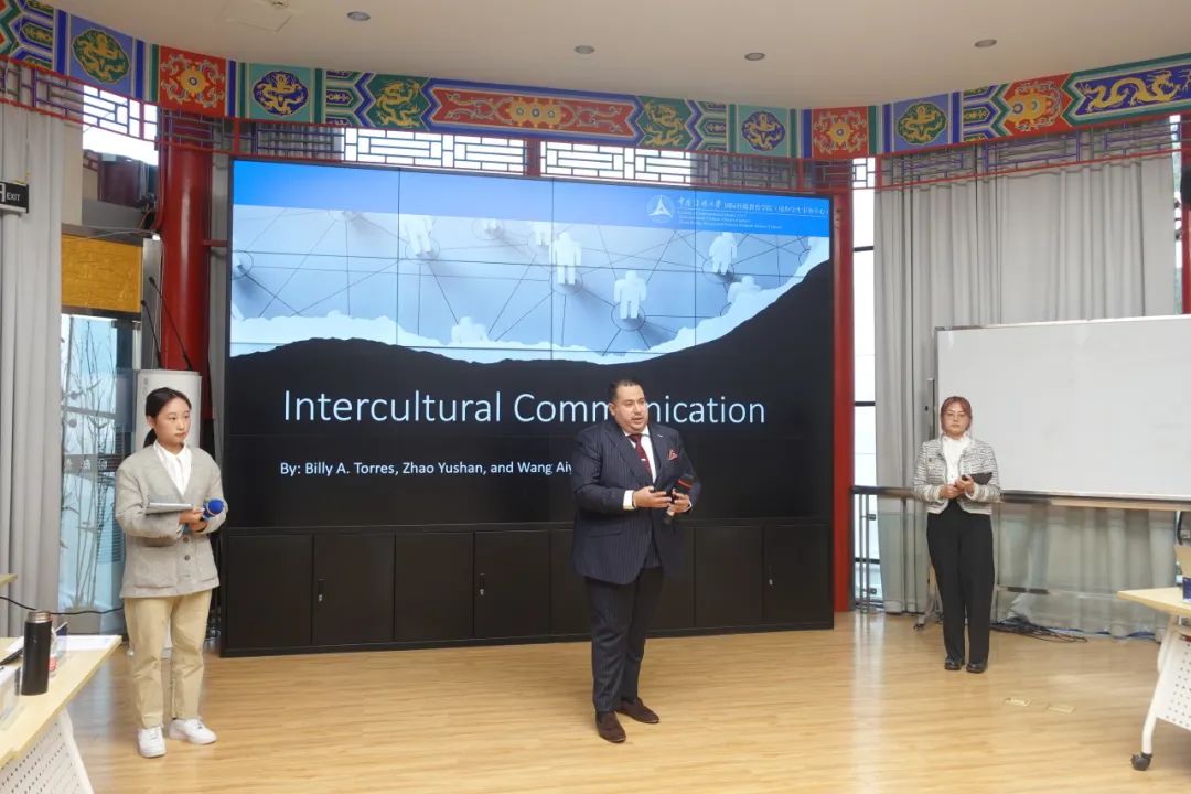 在跨文化沟通模块的课程案例分享中,外教Billy A. Torres从名词定义、教学目标、课程结构三个部分介绍了他所任教的《跨文化沟通基础》课程。他提到,设计这门课的初衷是因为他认为跨文化交流者不能止步于“知道”与他一起工作的人与他有着不同的习惯、目标和思维模式,而必须能够与他们合作,既不在对抗中失去自己的价值观,也不躲在知识的高墙后自我保护。传播学21级赵雨杉、22级汪艾宜两位同学分享了课程学习体验,本课程带给他们的不仅是沟通能力上的提升,更是一种思维方式的转变。
