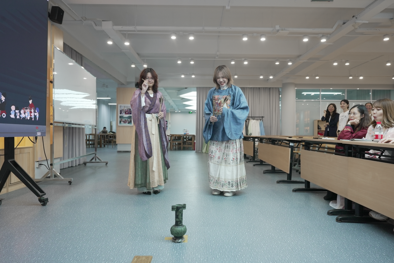 讲座过程中,蔡老师邀请了几名同学上台演示,并为中外学生讲解了不同朝代和身份的官员帽子的形制。通过生动的讲述和互动,学生们对汉服知识和礼仪有了更深入的了解。活动现场气氛热烈,参与者积极互动,收获颇丰。