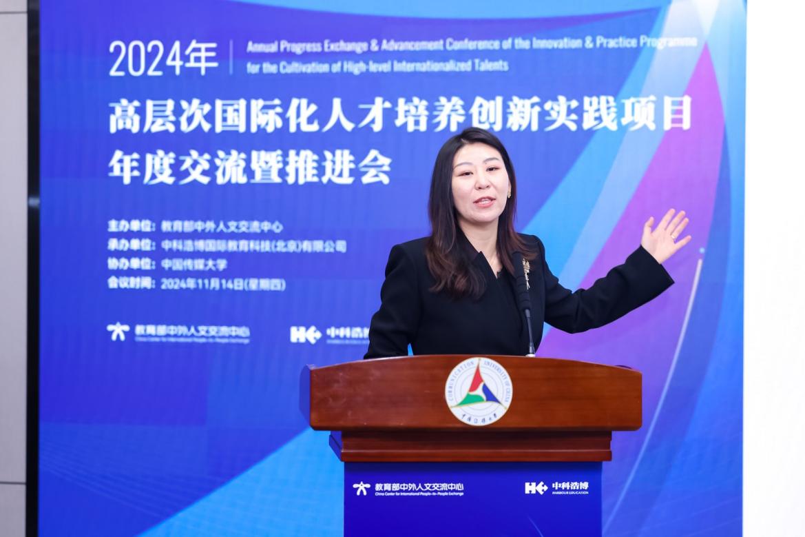 在信息发布环节,项目服务单位中科浩博总裁孙中雯回顾了项目实施以来的发展历程。她表示,高层次项目在教育部中外人文交流中心统筹、专家指导、校企合作共建的模式下,已培养出众多具有全球视野和人文交流意识、有能力参与全球协作与竞争的人才,为各行各业在对外开放的高质量改革发展献力献礼。未来将引入更多高质量教育资源和进一步做好教育公共服务工作,为高校加快培养具有全球视野的高层次国际化人才提供更坚实的支撑和有效的助力。