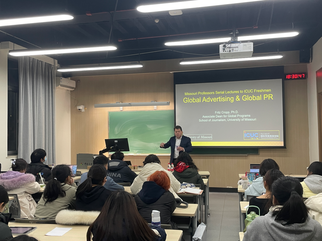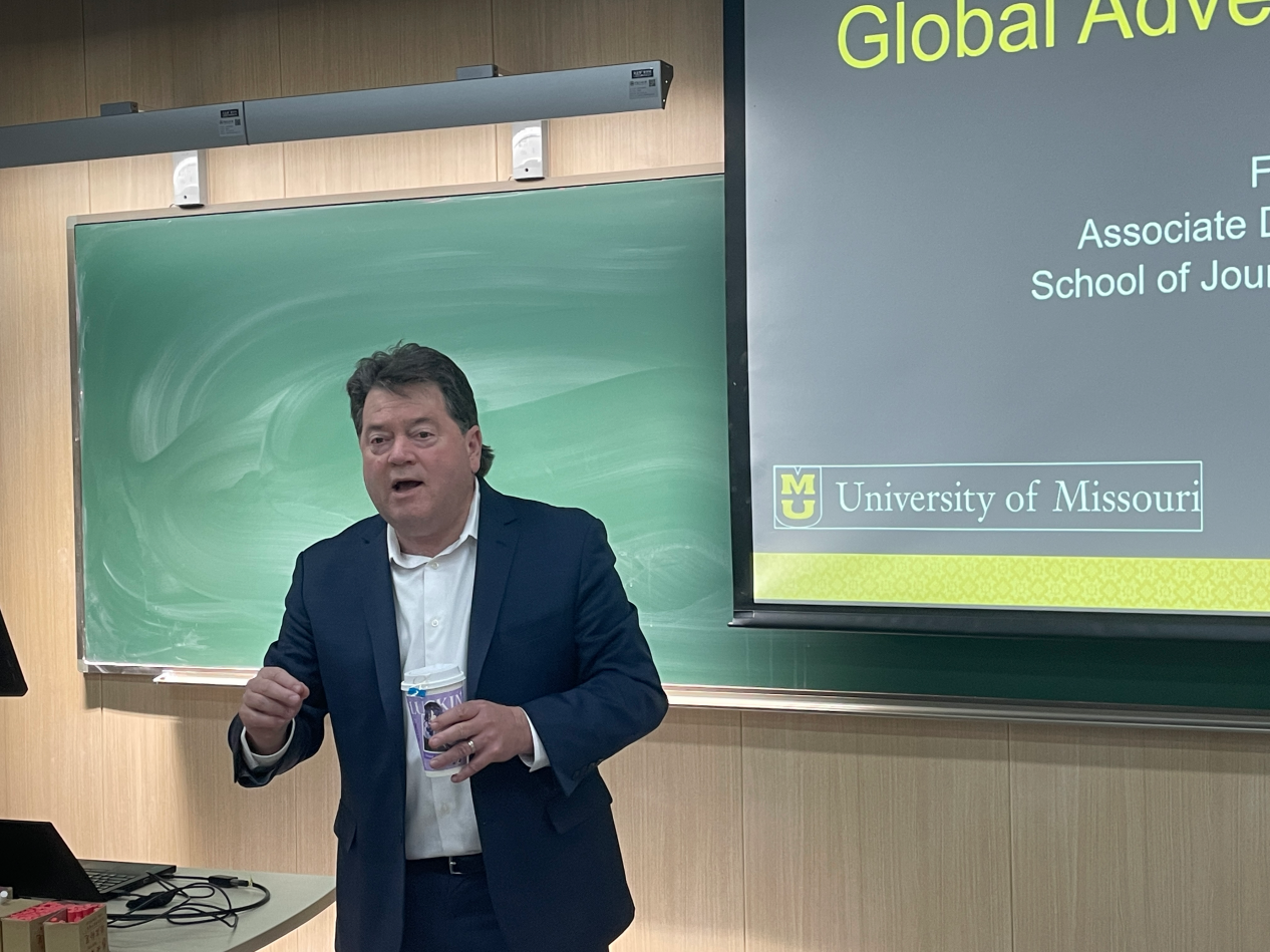 (通讯员 摄影 任天威)12月9日晚6点,密苏里大学新闻学院副院长Fritz Cropp教授举行了“全球广告和全球公共关系”讲座。该讲座由密苏里新闻学院环球项目部中国项目合作主任章于炎博士主持及介绍。