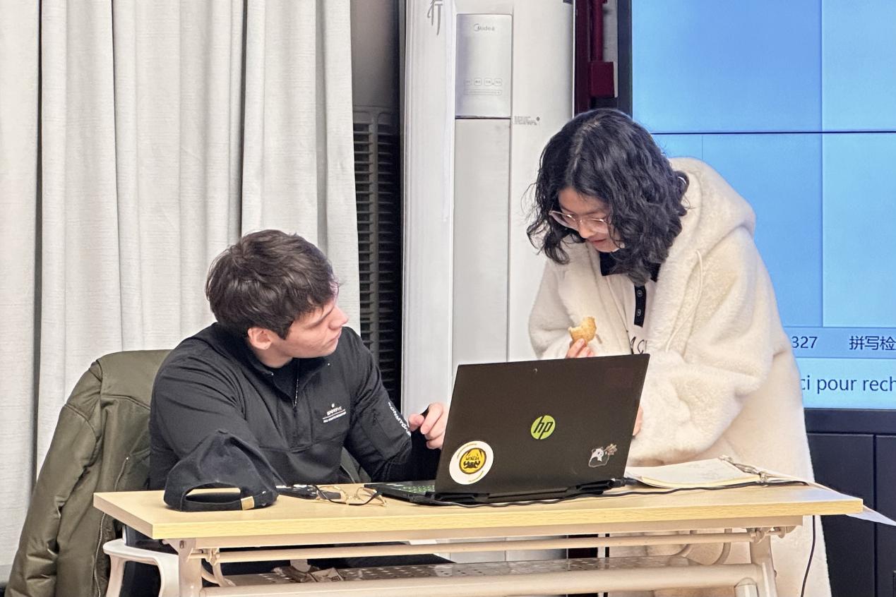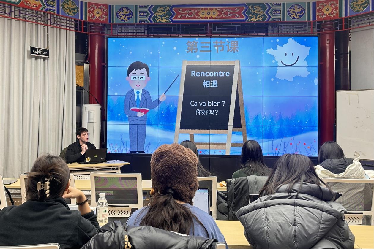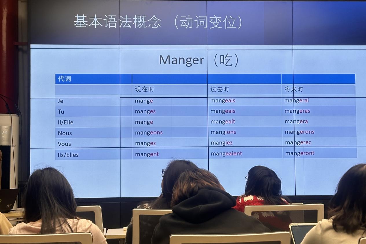 本学期法语训练营的课程内容涵盖了法语发音、基础语法、日常对话等多个方面。课程教师麦文带领同学们从基本问候语和简单发音学起,逐步深入到名词的阴阳性、冠词搭配、动词变位等语法知识,以及自我介绍等日常对话练习,帮助同学们系统地建立法语语言框架和交流能力。此外,课程还融入法国城市、建筑、礼仪等内容的介绍,拓宽学生全球视野,增进对法国文化的理解与尊重。