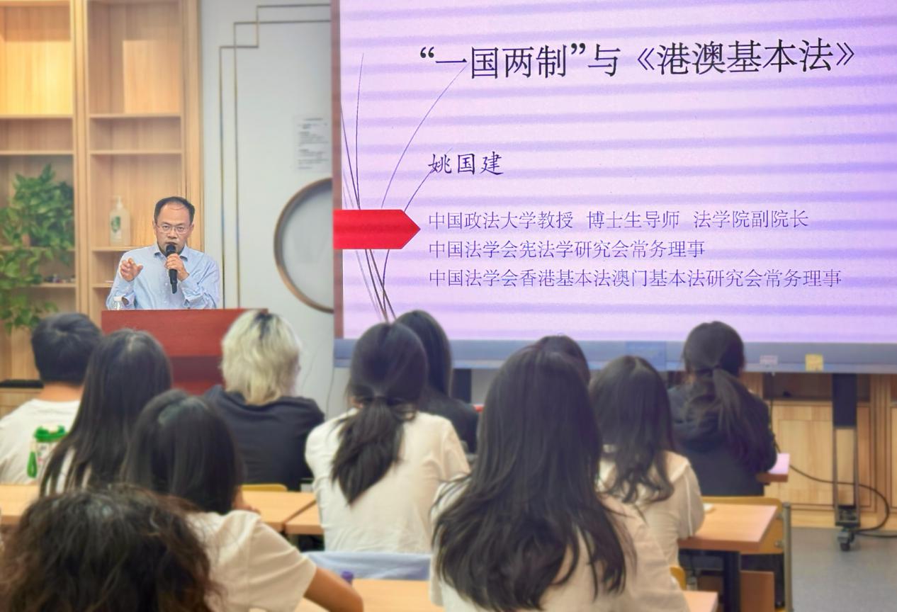 下午的专题讲座邀请了中国政法大学法学院副院长、全国港澳基本法研究会常务理事姚国建教授,围绕“‘一国两制’与港澳基本法”展开深入讲解。姚教授从港澳问题的历史渊源谈起,系统阐述了“一国两制”理论的核心内涵,并详细解读了香港基本法和澳门基本法的内容与意义。同学们纷纷表示,讲座内容丰富、观点鲜明,对“一国两制”的实践有了更深刻的认识。
