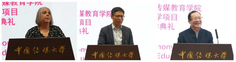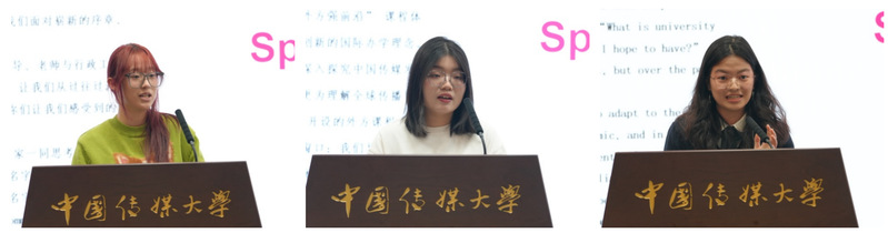 在新生代表发言环节,本科新生华茗贻与研究生新生黄一诺先后发言。她们以"CUC"三个字母为引,创新性地诠释了"沟通·独特·创造"的核心理念,呼吁全体新生牢记传媒使命,在探索中突破自我,在创新中实现价值。黄一诺特别提到,跨文化交流已融入日常生活的每个细节,从办公室时间探讨文化差异,到工作坊中提升学术英语能力,这些经历都在悄然打破文化隔阂。